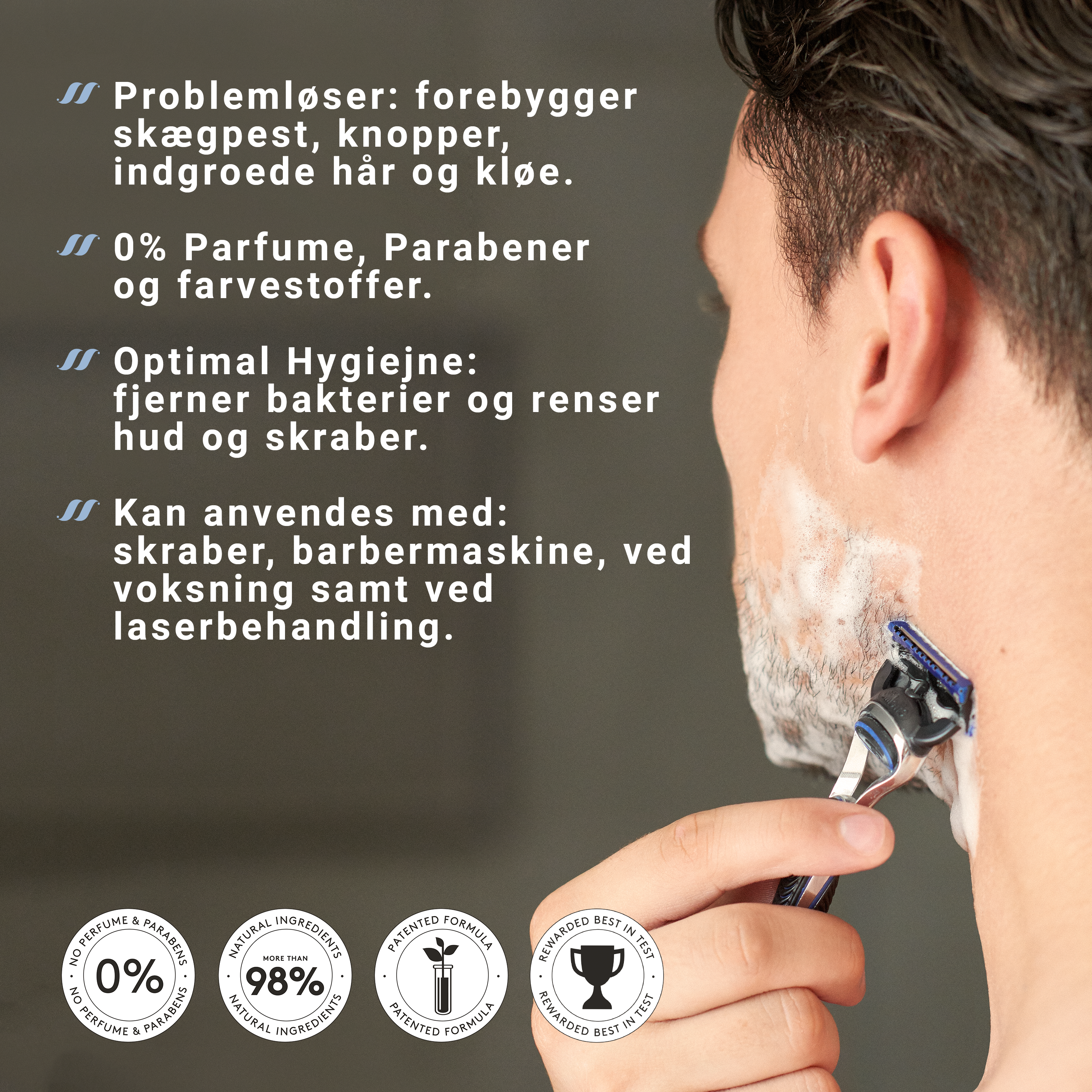 “Endelig en barberskum, der rent faktisk virker. Ikke flere buler fra barbering – bare rolig, glat hud.”