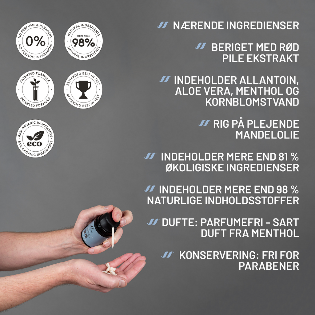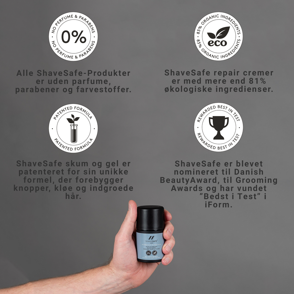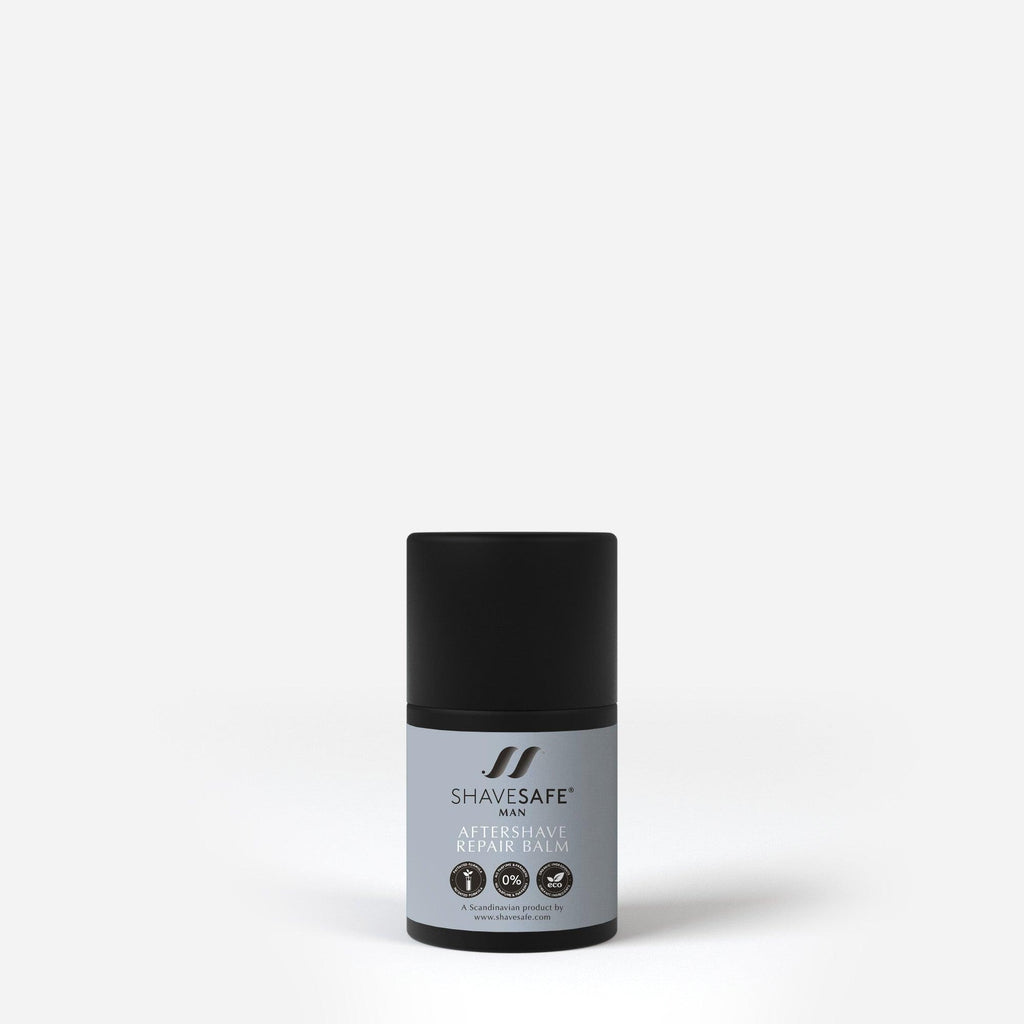 ShaveSafe Aftershave Repair Balm with cooling menthol is the perfect aftercare for the face and neck in case of irritation after shaving. The cream is antibacterial and leaves the skin soft, nutritious and supple without buds, itching and ingrown hairs. The cream contains organic, healing cornflower water and is enriched with nutritious ingredients such as Allantoin, organic Aloe Vera, organic and antibacterial red willow extract and softening almond oil.